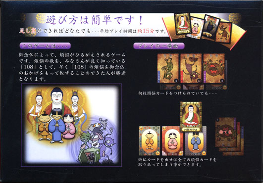 カード100枚、 説明書 ※無碍光は「むげこう」と読みます。 お念仏で煩悩を退治せよ!カードには「お念仏」と、これを妨害する「煩悩」と、 「念仏」カードの数値の合計をちょうど108にして、 |