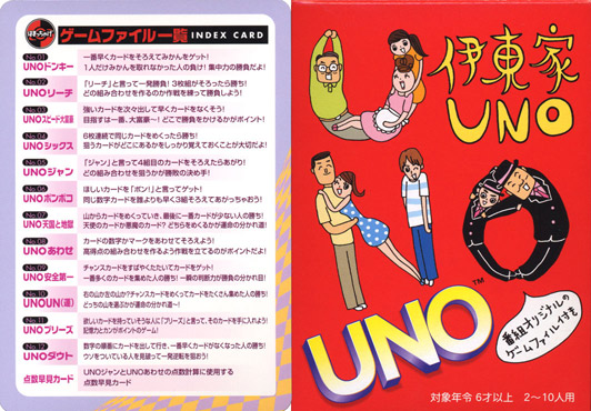 定番カードゲームのUNOに 『伊東家の食卓』ゲームコーナーのロゴが入っています。 新しい遊び方を書いたカード12種が付いており、 日本テレビの番組『伊東家の食卓』のなかでも 紹介しています。
